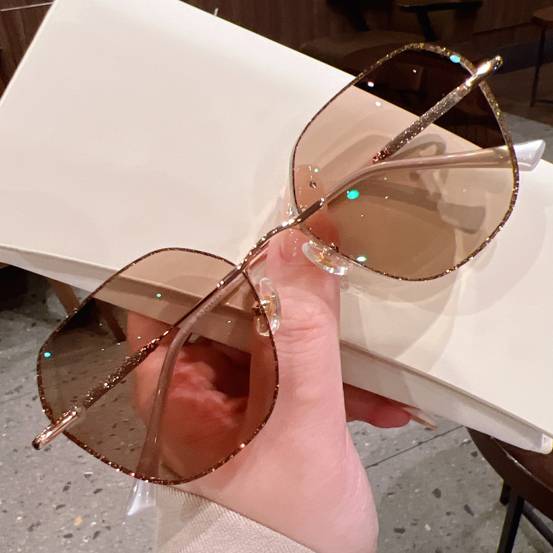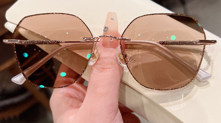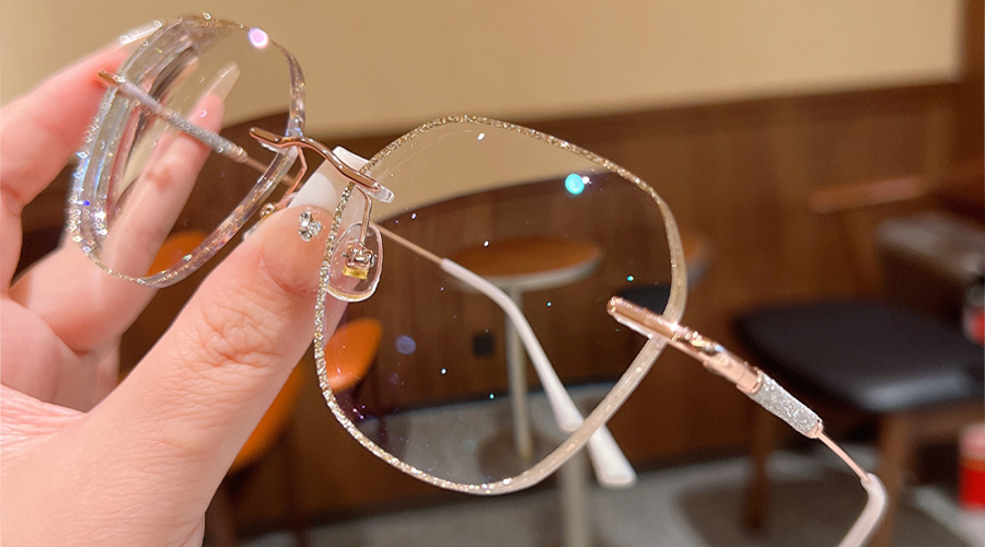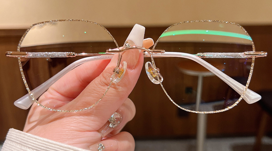 These "barely there" rimless glasses let your style shine with all-day comfort. Irregular lenses with gold glitter adorning the edges add a touch of sophistication to this frame. Slim and delicate temples decorated with glitters add glamorous charm and a modern touch to these glasses. Adjustable nose pads increase wearing comfort.
