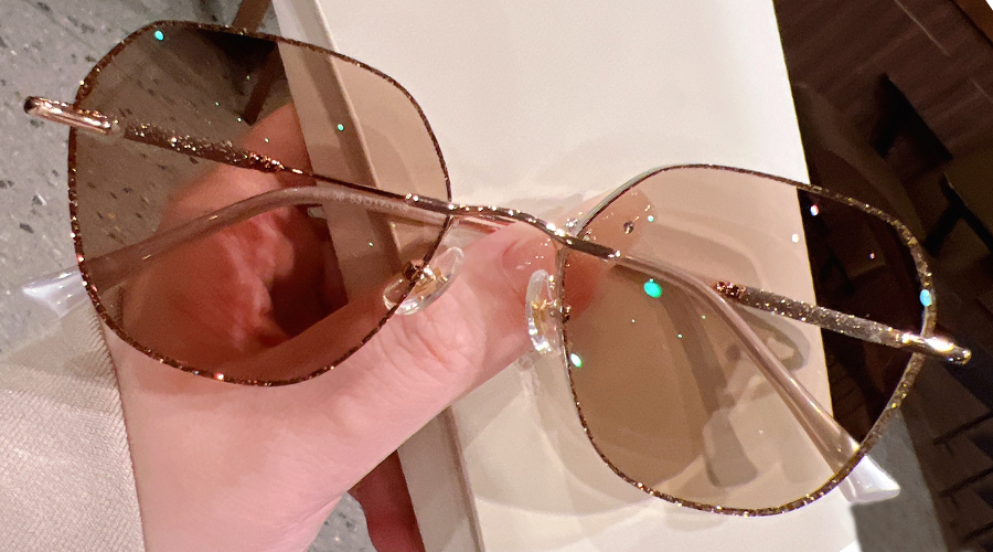 These "barely there" rimless glasses let your style shine with all-day comfort. Irregular lenses with gold glitter adorning the edges add a touch of sophistication to this frame. Slim and delicate temples decorated with glitters add glamorous charm and a modern touch to these glasses. Adjustable nose pads increase wearing comfort.