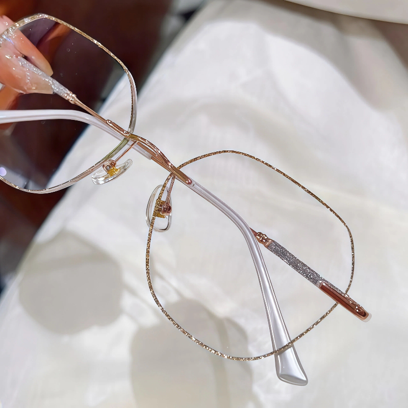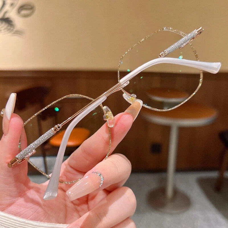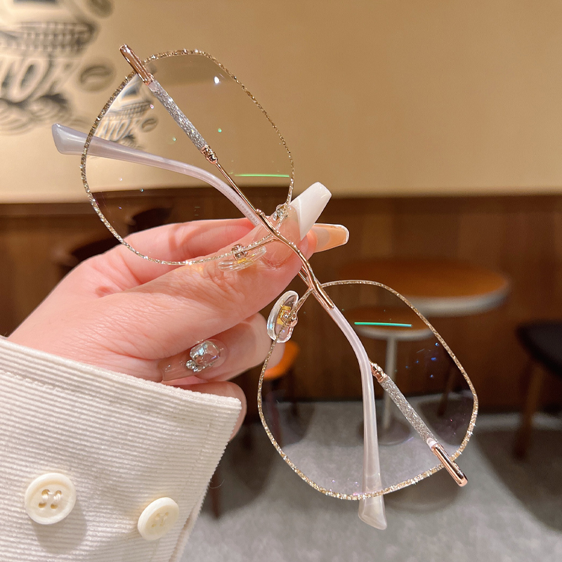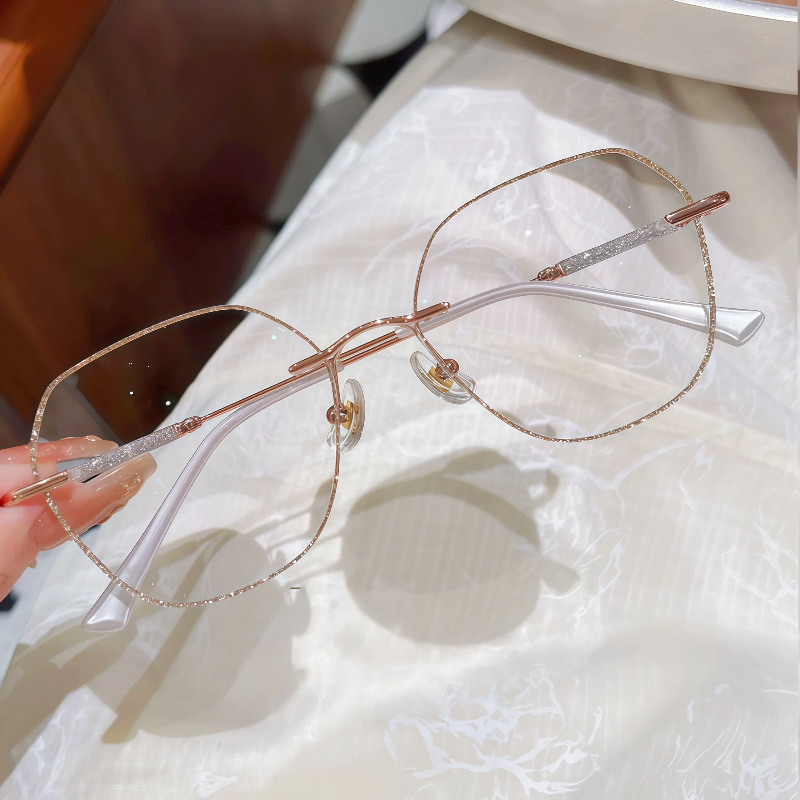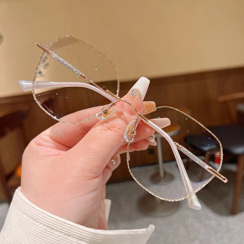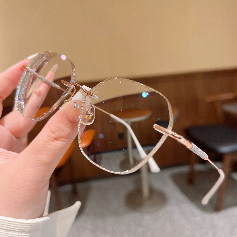 DESCRIPTIONThese "barely there" rimless glasses let your style shine with all-day comfort. Irregular lenses with gold glitter adorning the edges add a touch of sophistication to this frame. Delicate temples decorated with glitter add glamorous charm and a modern touch to these glasses. Adjustable nose pads increase wearing comfort. It typically takes 5 to 7 business days to process prescription rimless lenses.
