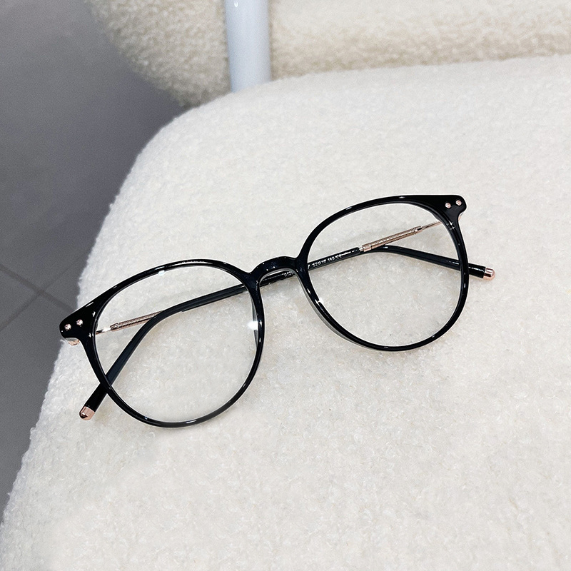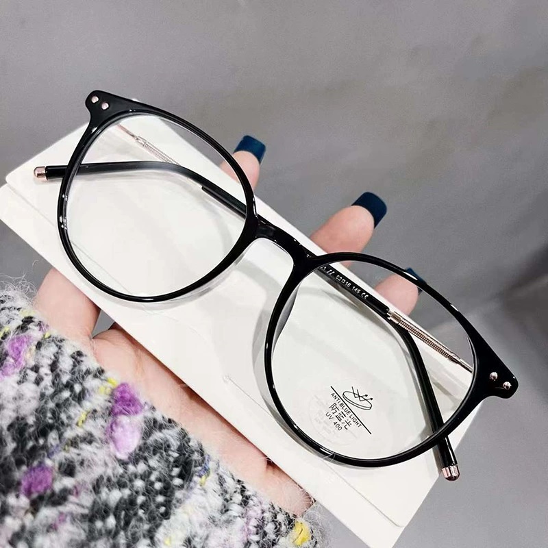 DESCRIPTIONElevate your everyday look with these trendy round glasses, crafted from featherlight TR90 for all-day comfort! The one-piece nose pads offer a snug, pressure-free fit, while the slim, tapered temple arms add a touch of elegance. Accented with sleek metal rivets on both sides of the frame, they blend timeless vintage charm with modern edge.