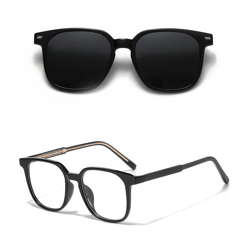 Switch effortlessly between clear vision and sun protection with our innovative magnetic 2-in-1 system. The sleek square-frame prescription glasses feature instant-attach polarized TAC clip-on – no tools required. Perfect for driving, outdoor activities, or everyday style.