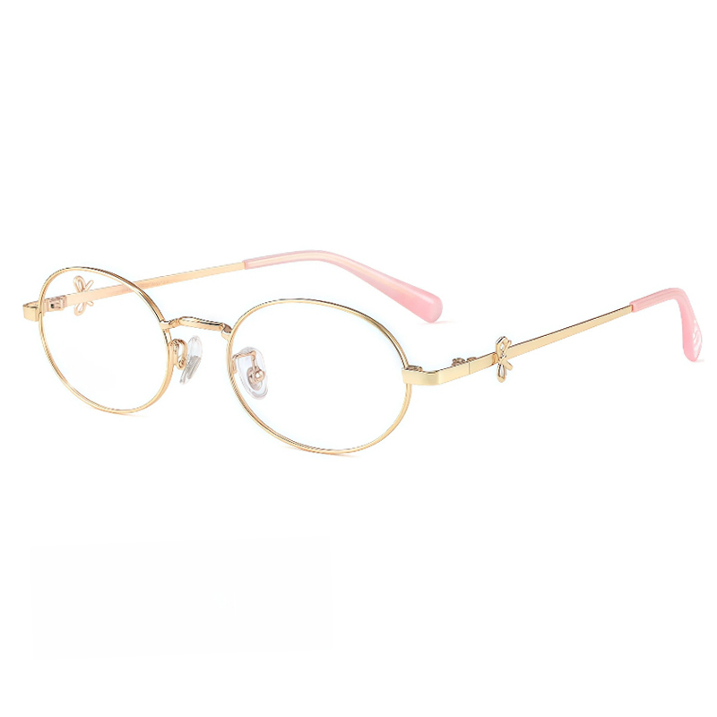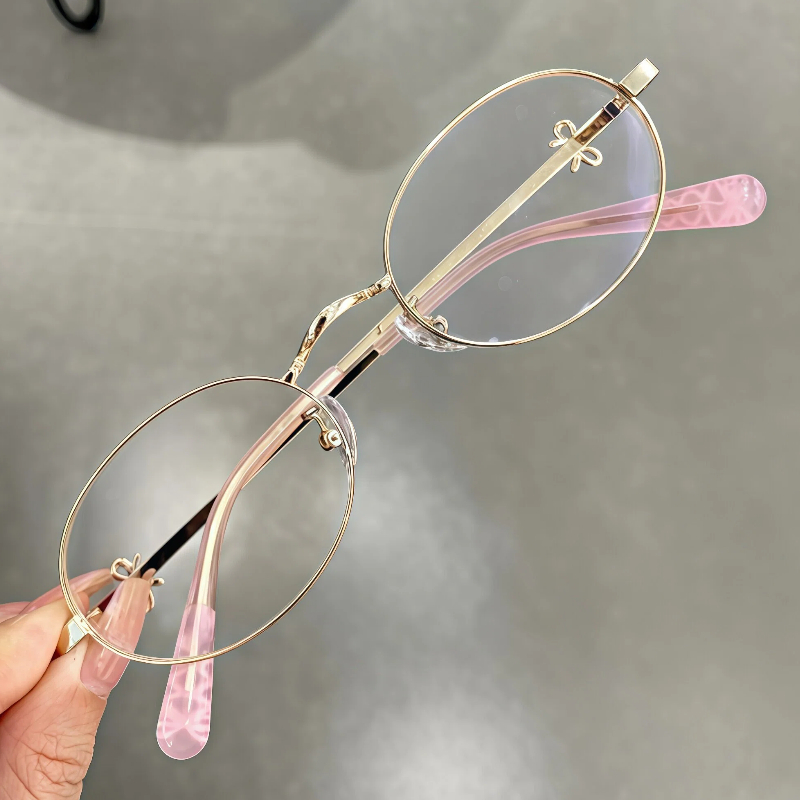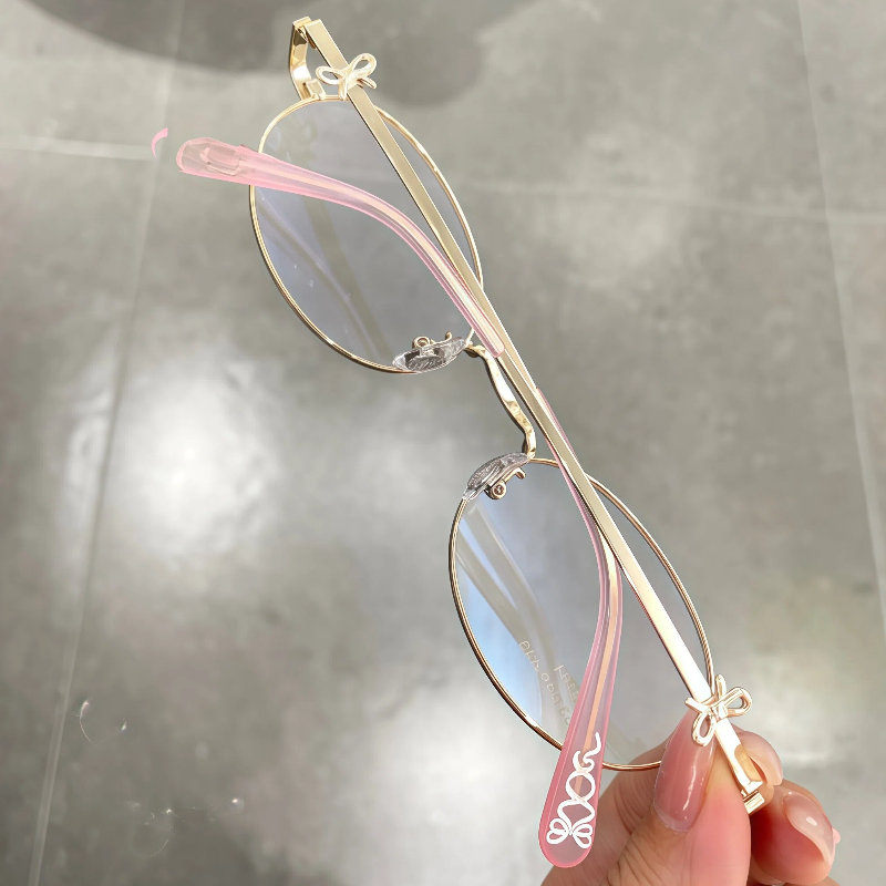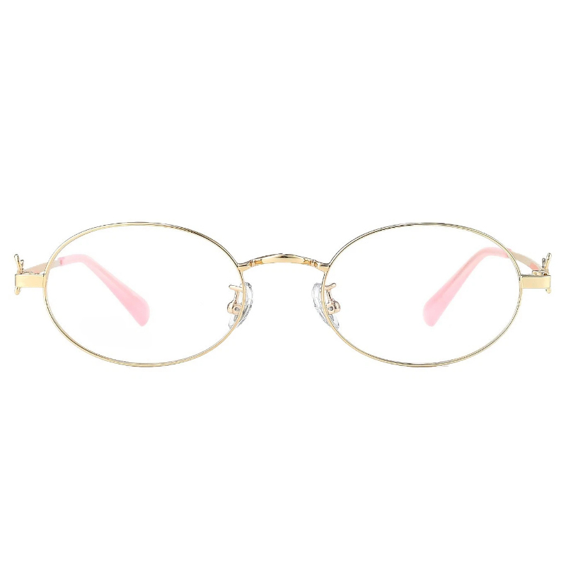 These delicate oval eyeglasses for women are crafted from lightweight metal, featuring adorable bow decorations on the temple arms and matching bow patterns on the temple tips. The adjustable nose pads ensure a personalized, comfortable fit, adding a sweet, feminine touch to your everyday look.