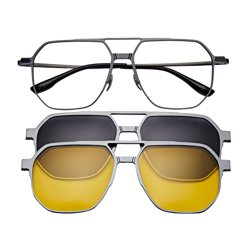 You can easily change the lens according to different occasions. Indoors they are clear glasses with anti-scratch coating and anti-reflective coating. Outdoors, can turn into polarized sunglasses by using the flexible sunshade clip-on that attaches easily to the frame with magnets. The gray polarized TAC lenses can effectively reduce extra bright light glares. At night, you can put on the night vision lens clip-on to reduce glare while driving.