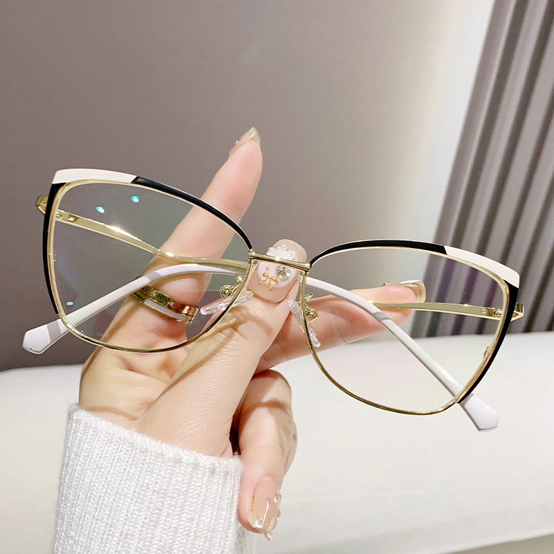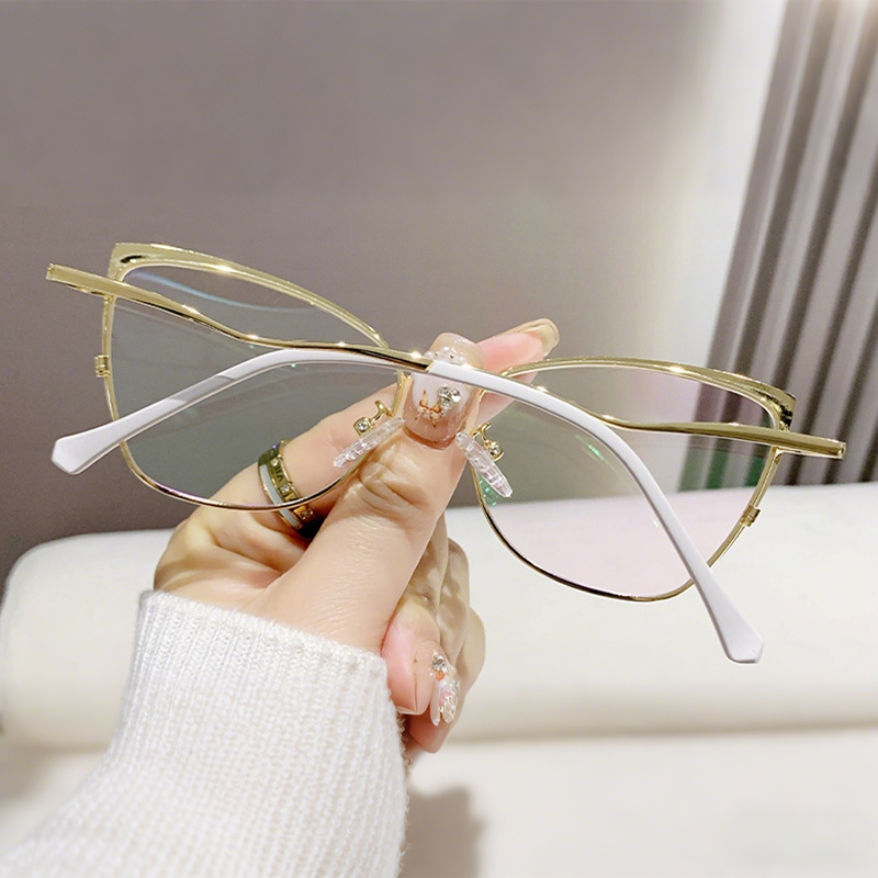DESCRIPTIONTry these chic cat-eye glasses on today! With shiny gold decorations and a stylish cat-eye shape, this durable frame is trendy and comfortable. Adjustable nose pads make you enjoy all-day comfort.