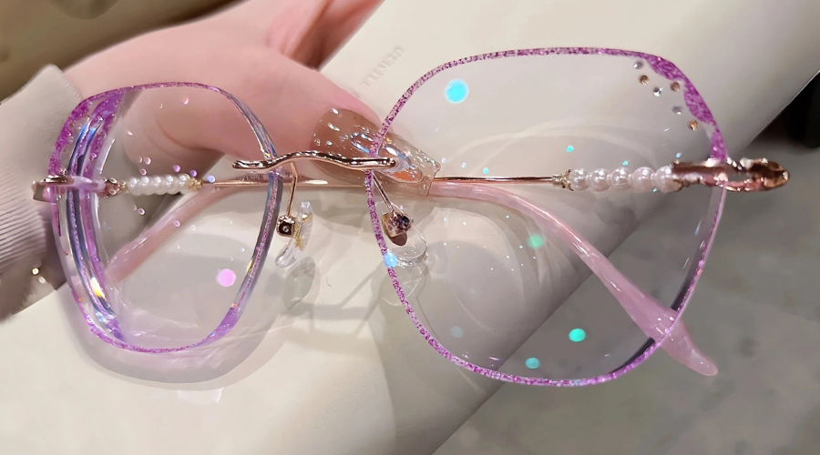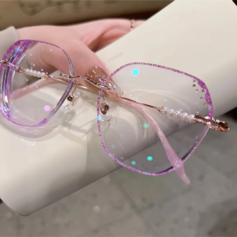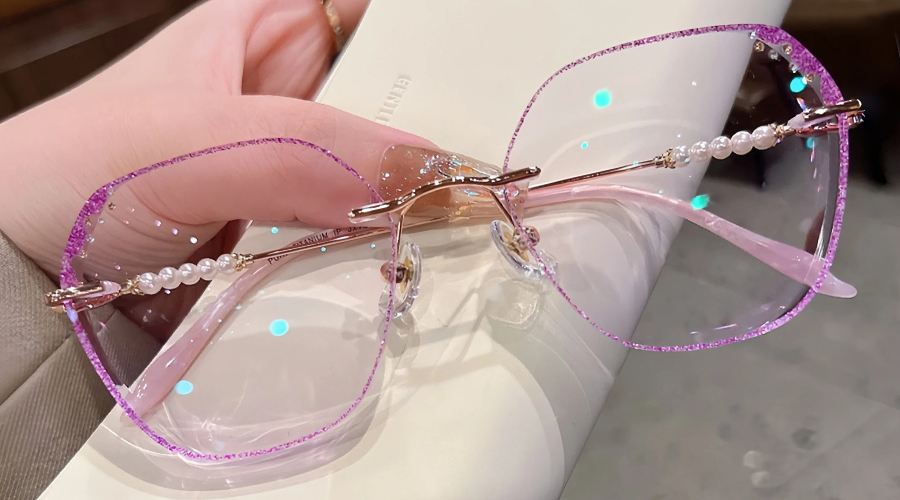 Dreamy is a pair of rimless glasses unmatched in glamour and finesse. These glasses come in Titanium and irregular rimless lenses. They are sturdy, ultra-lightweight, and corrosion-resistant. The glitters on the lens edges and pearl decoration on the arms give this frame a mysterious style.