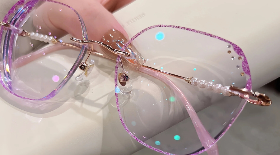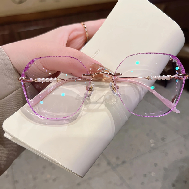 DESCRIPTIONDreamy is a pair of rimless glasses unmatched in glamour and finesse. These glasses come in Titanium and irregular rimless lenses. They are sturdy, ultra-lightweight, and corrosion-resistant. The glitters on the lens edges and pearl decoration on the arms give this frame a mysterious style.