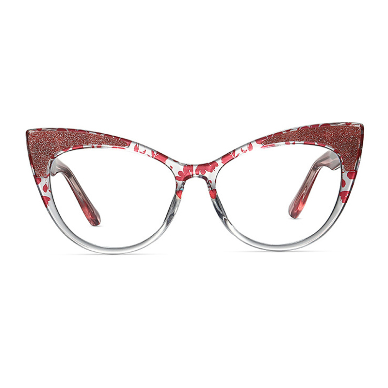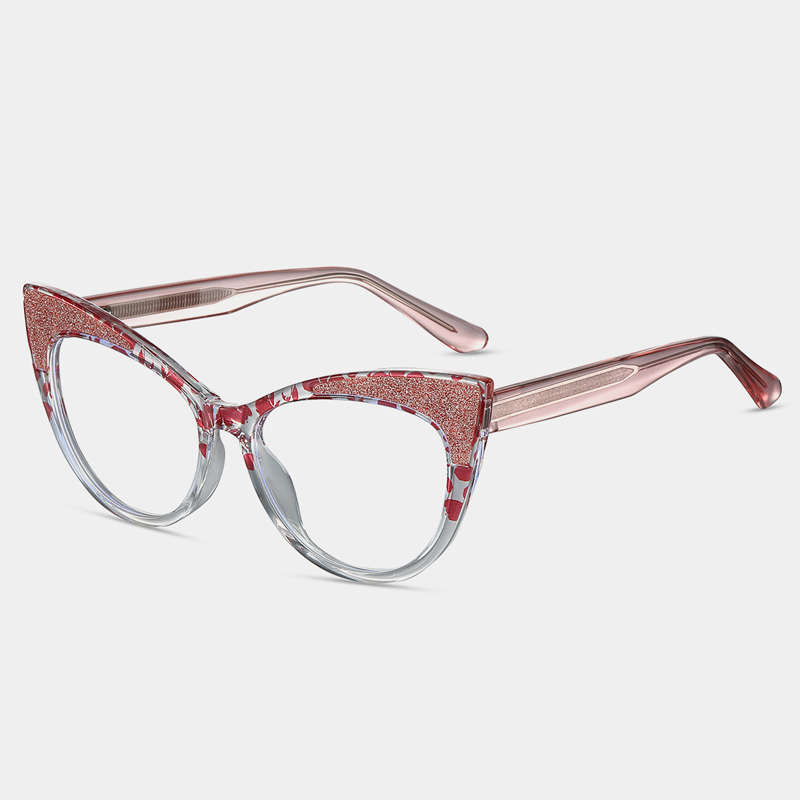 DESCRIPTIONShow your sophisticated side in these modern cat-eye glasses. Made from glossy hand-polished acetate, the frame features a unique glitter pattern detail at the corners. Spring hinges and integrated nose pads add flexibility and comfort.