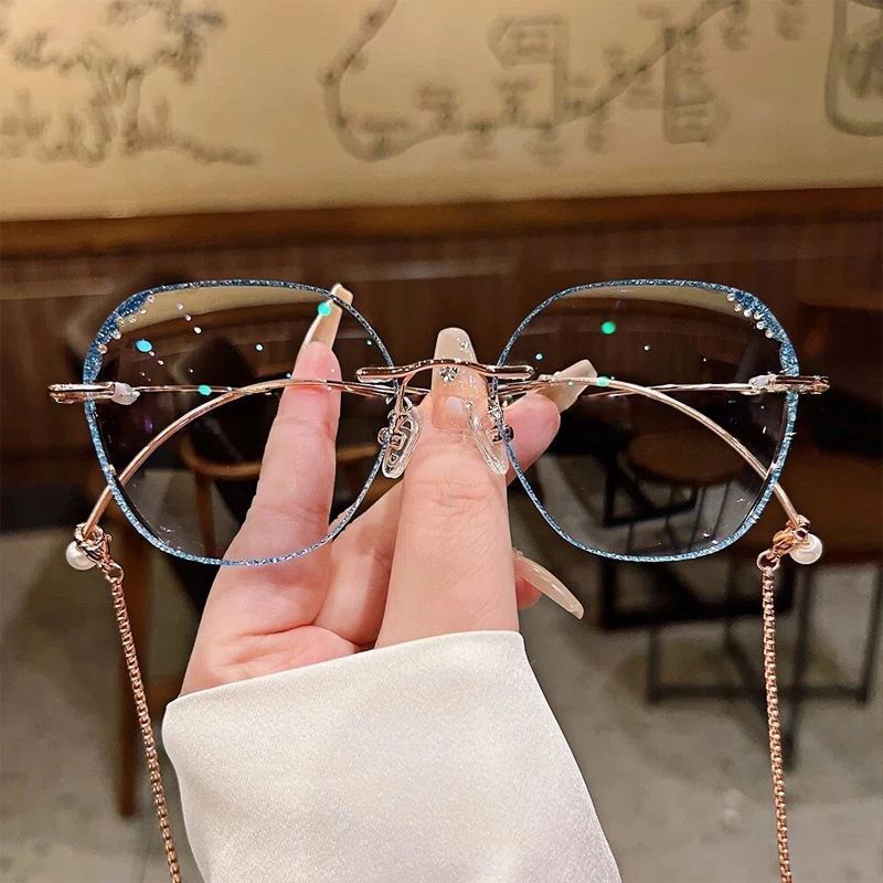 DESCRIPTIONThis fabulous frame feature doubles wavy metal temples with delicate chains for a retro look. The blue rhinestone details on the irregular lens edges are very eye-catching. Premium metal material and adjustable nose pads make them super light and comfortable.