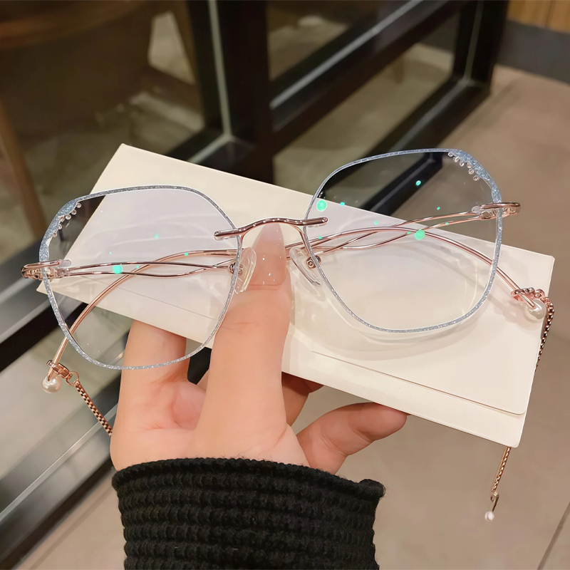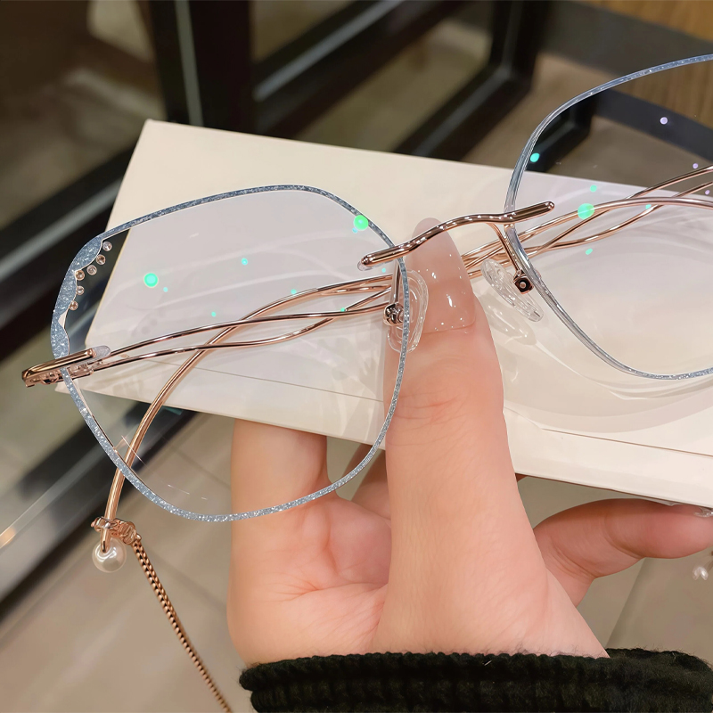 DESCRIPTIONThis fabulous frame feature doubles wavy metal temples with delicate chains for a retro look. The blue rhinestone details on the irregular lens edges are very eye-catching. Premium metal material and adjustable nose pads make them super light and comfortable.
