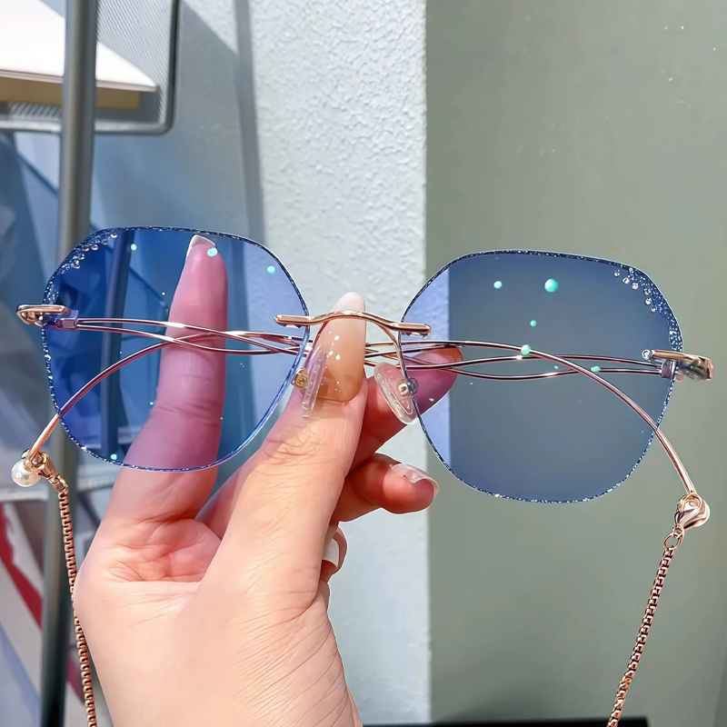 DESCRIPTIONThis fabulous frame feature doubles wavy metal temples with delicate chains for a retro look. The blue rhinestone details on the irregular lens edges are very eye-catching. Premium metal material and adjustable nose pads make them super light and comfortable.