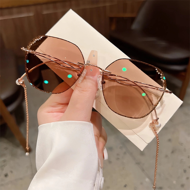 DESCRIPTIONThis fabulous frame feature doubles wavy metal temples with delicate chains for a retro look. The rhinestone details on the irregular lens edges are very eye-catching. Premium metal material and adjustable nose pads make them super light and comfortable.