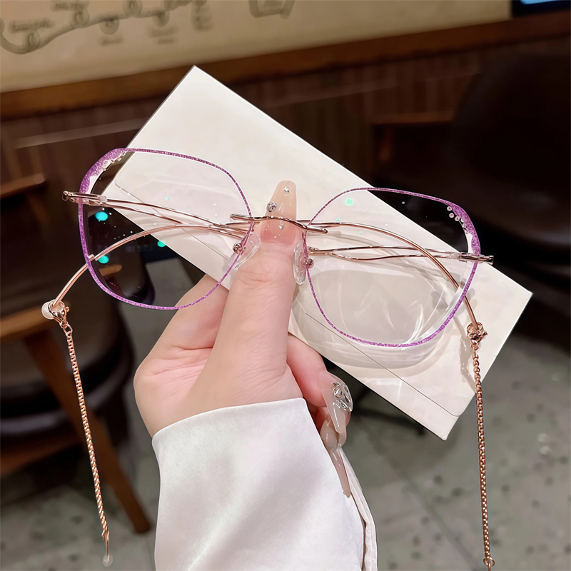 DESCRIPTIONThis fabulous frame feature doubles wavy metal temples with delicate chains for a retro look. The rhinestone details on the irregular lens edges are very eye-catching. Premium metal material and adjustable nose pads make them super light and comfortable.
