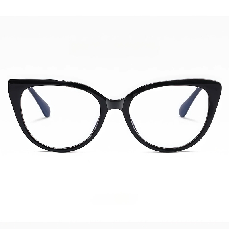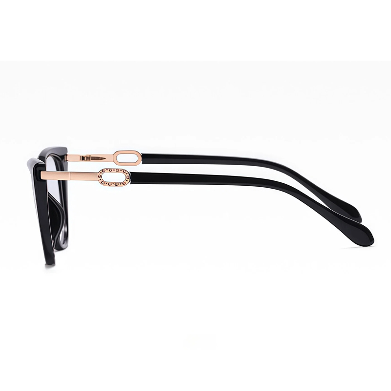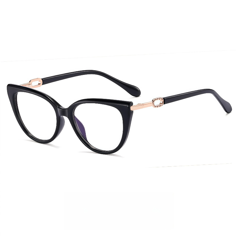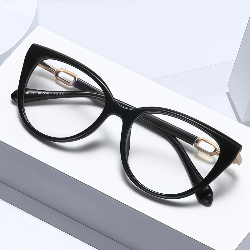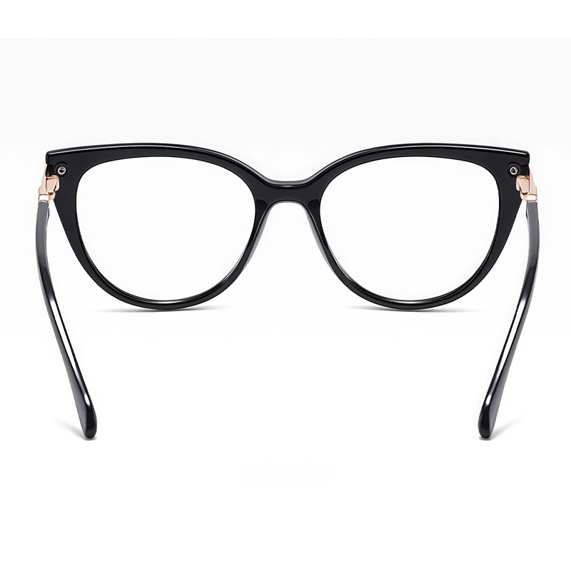 These bold cat-eye glasses for women are crafted from lightweight TR90 material, featuring integrated nose pads for all-day comfort and spring hinges for flexible, secure wear. The standout, unique metallic detailing on the temple arms adds a modern, sophisticated touch to the timeless silhouette.