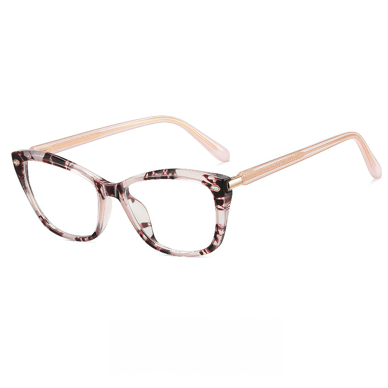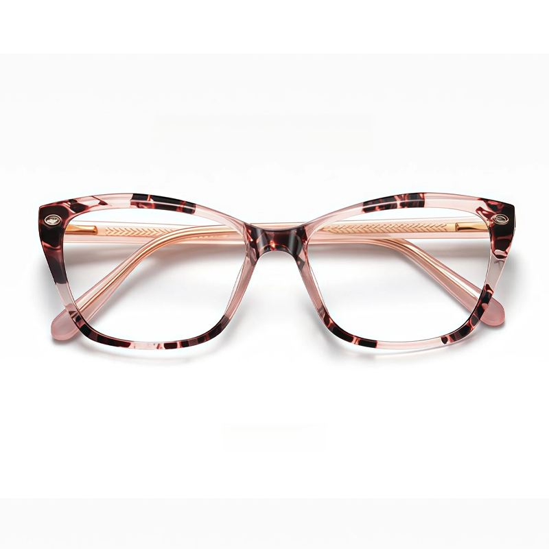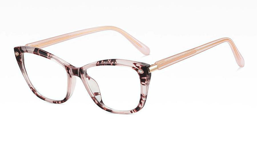 These chic cat-eye glasses are constructed from a lightweight TR90+CP blend, featuring integrated nose pads for all-day comfort and spring hinges for a flexible, secure fit. The delicate pink tortoiseshell pattern adds a retro, feminine touch, while the gold textured metal temple arms elevate the overall sophistication. Perfect as a stylish accessory or functional prescription eyewear.