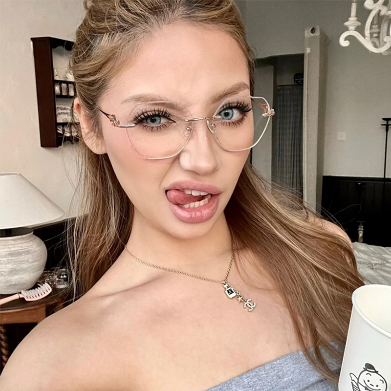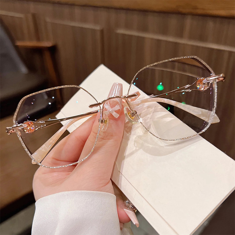 These "barely there" rimless glasses let your style shine with all-day comfort. Irregular lenses with gold powder adorning the edges add a touch of sophistication to this frame. Metal temples decorated with topaz and marbled temple tips enhance the elegant style.