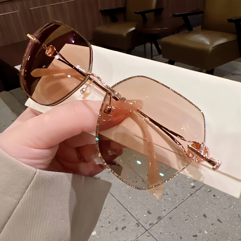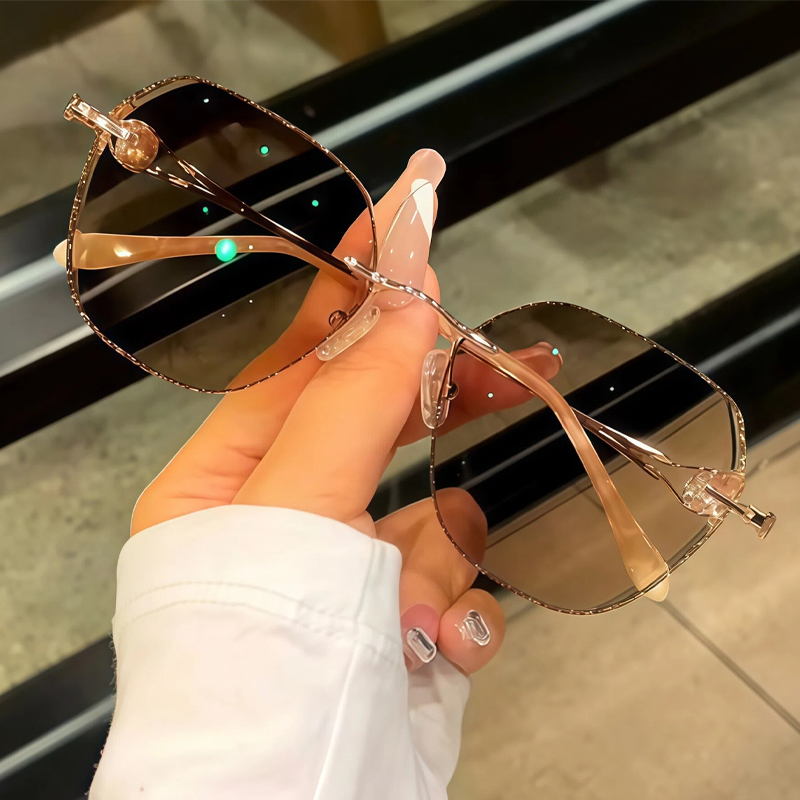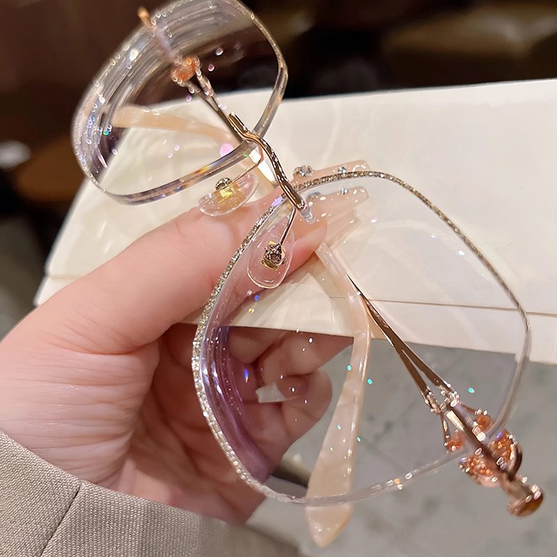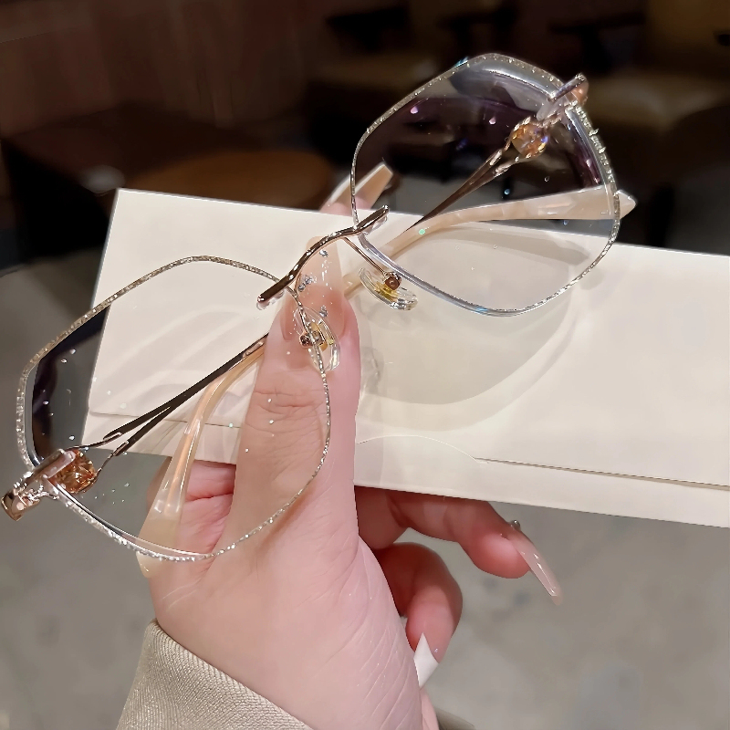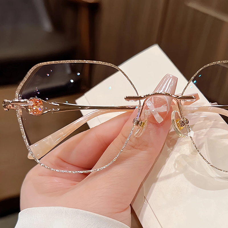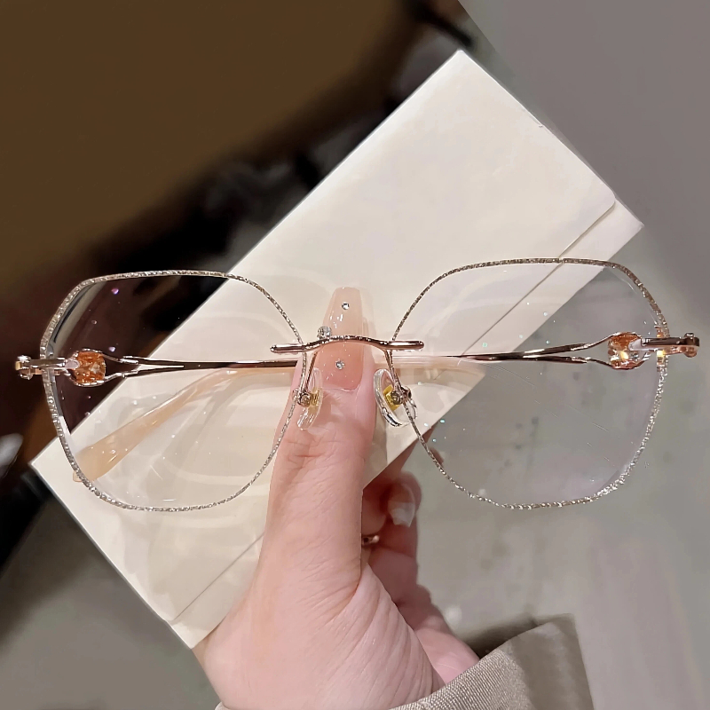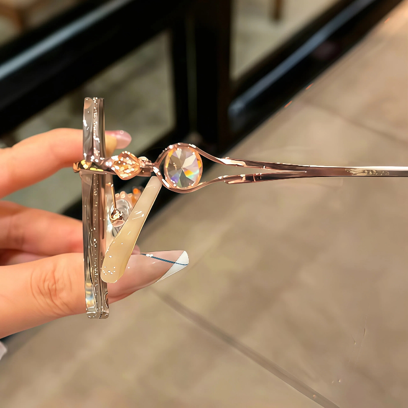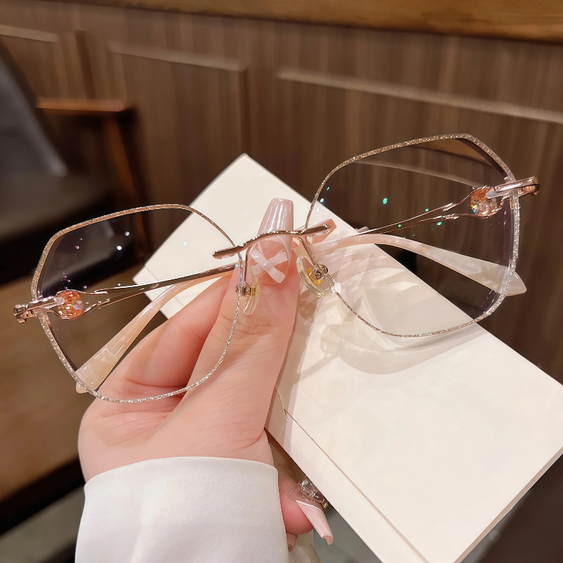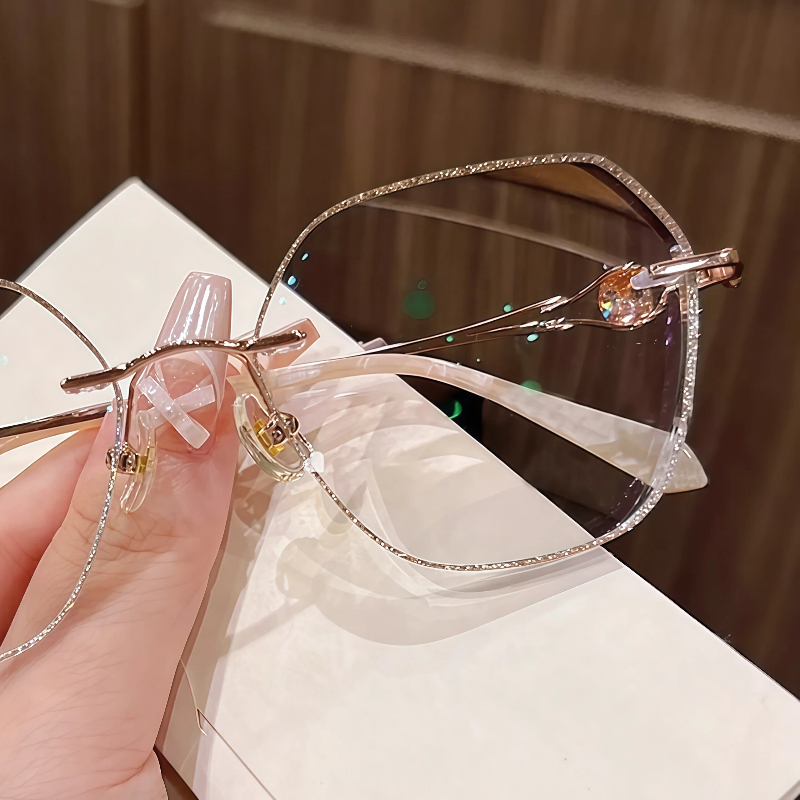 DESCRIPTIONThese elegant geometric rimless eyeglasses for women feature a lightweight metal frame with a polished rose gold finish. The lenses are edged with shimmering gold glitter for a sparkling, glamorous look, while the temple arms are adorned with faceted crystal accents for added luxury. Adjustable nose pads ensure a personalized, comfortable fit for all-day wear. A perfect blend of refined design and eye-catching details.⏰It typically takes 7 business days to process prescription rimless lenses.