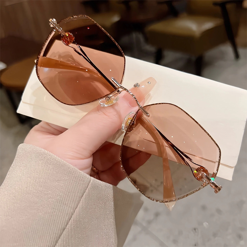 These "barely there" rimless glasses let your style shine with all-day comfort. Irregular lenses with gold powder adorning the edges add a touch of sophistication to this frame. Metal temples decorated with topaz and marbled temple tips enhance the elegant style.