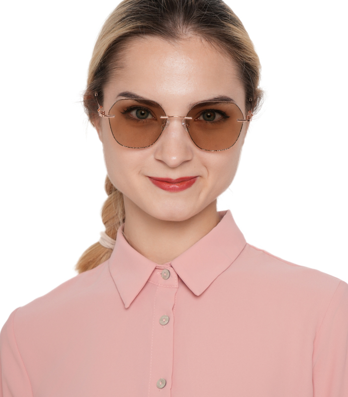 Photochromic Brown+Anti-Blue-Light Lenses: These rimless glasses feature Superflex lenses for impact resistance. Indoors, they are clear anti-blue-light glasses that block harmful blue light from digital screens. Outdoors, the lenses will change color from clear to brown and block UV rays.
