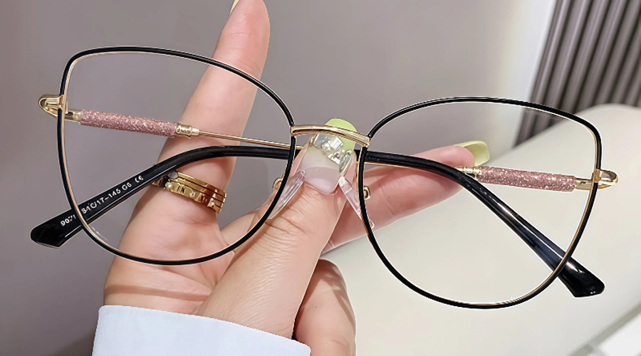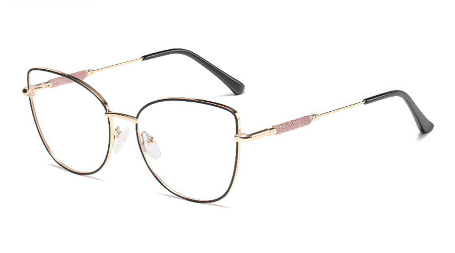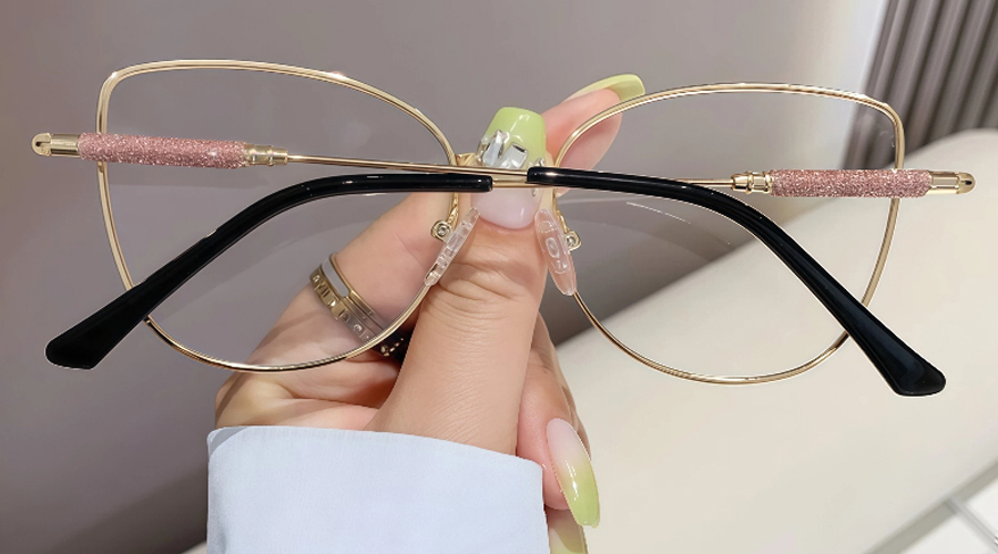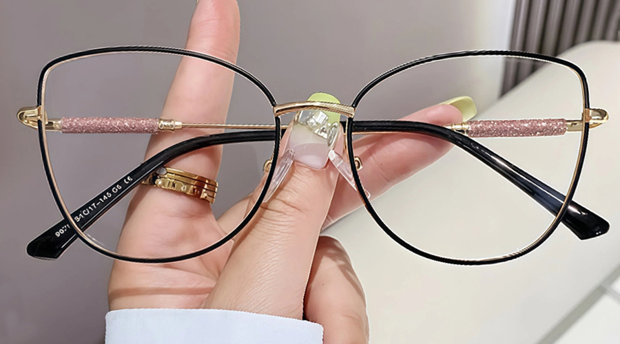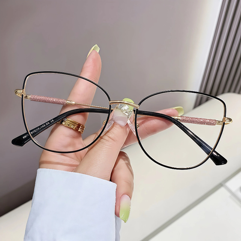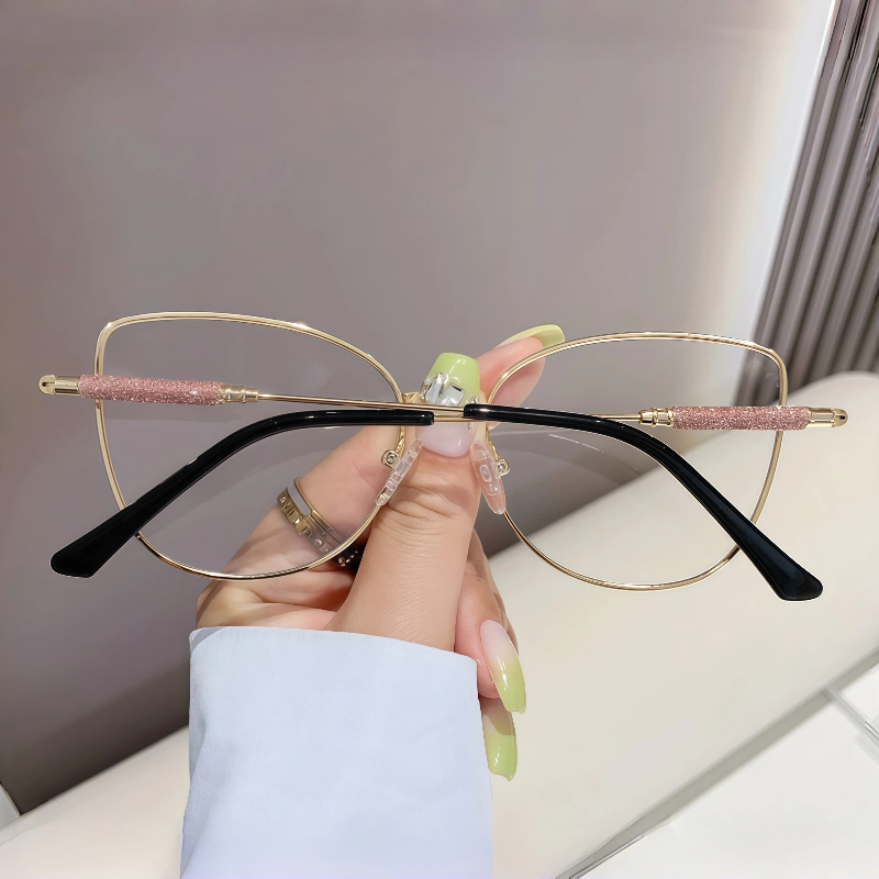 These elegant cat-eye eyeglasses for women are crafted from lightweight metal, featuring eye-catching glitter accents on the temple arms for a glamorous, sparkling finish. The adjustable nose pads ensure a personalized, secure fit, making them perfect for elevating your everyday style or special occasions.