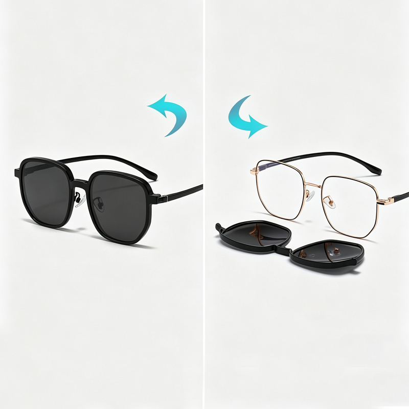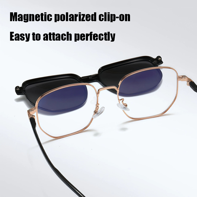 DESCRIPTIONThis magnetic clip-on glasses set offers two-in-one convenience, seamlessly switching between regular glasses and polarized sunglasses in seconds. The high-quality TAC polarized lenses block glare and harmful UVA/UVB rays. The secure dual-fit design—combining strong magnets and a hidden hook—ensures the clip stays firmly in place without slipping.