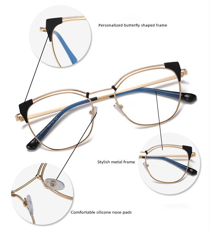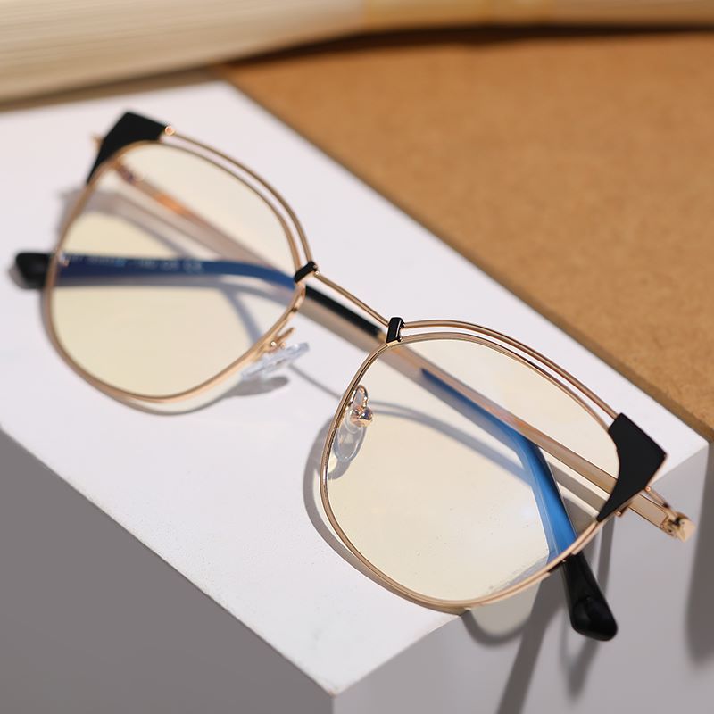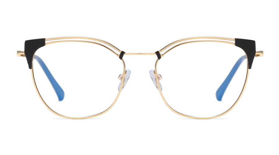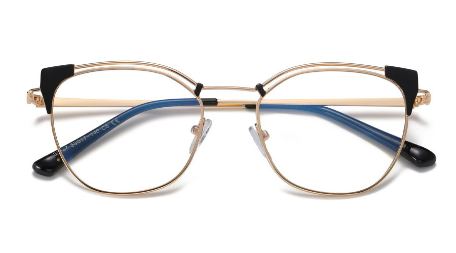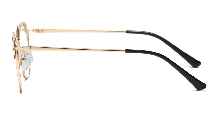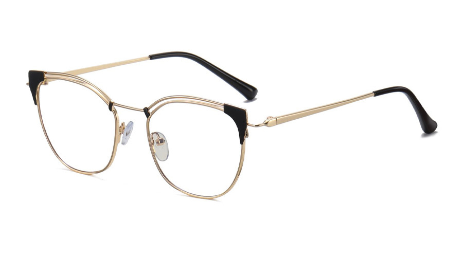 Show your sophisticated side in these modern cat-eye glasses. The metal cat-ear-shaped frame features a cut-out detail on the outer corners. The look features adjustable nose pads and High-quality plastic temple tips for added comfort.