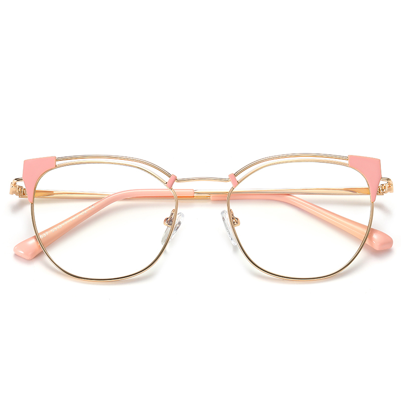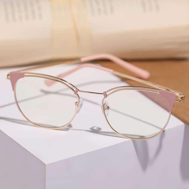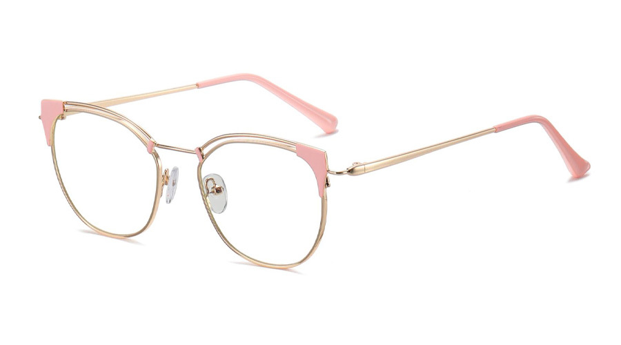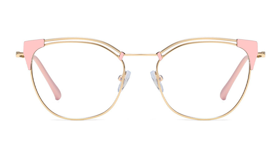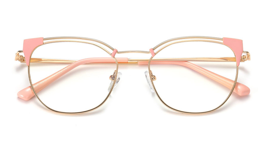 Show your sophisticated side in these modern cat-eye glasses. The metal cat-ear-shaped frame features a cut-out detail on the outer corners. The look features adjustable nose pads and High-quality plastic temple tips for added comfort.