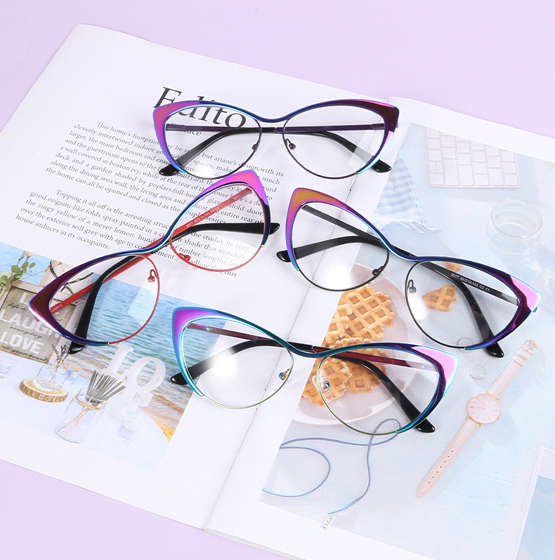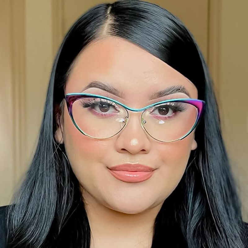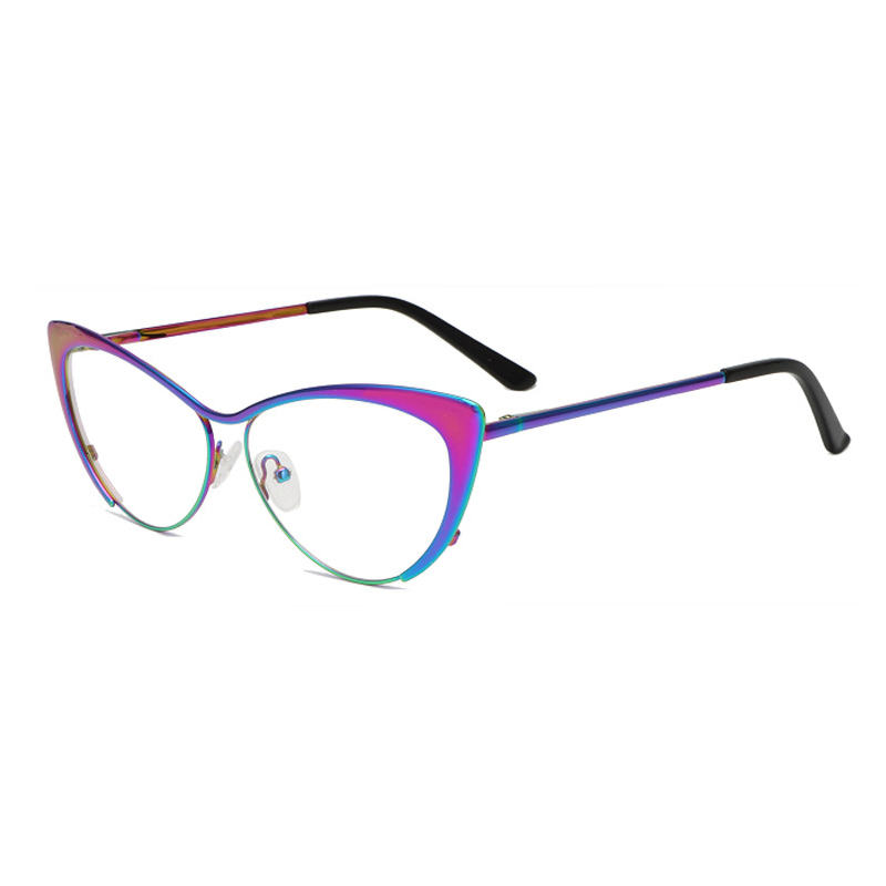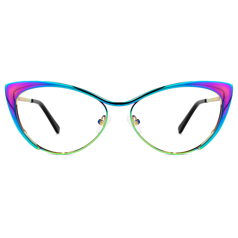 Add a little color to your everyday eyewear with these metal browline Cat-Eye glasses. Made from premium metal material, this frame features a simplistic design that is surprisingly comfortable. Besides, combined with a browline shape and aurora shiny finishes to highlight its unique style and depth. Adjustable nose pads and spring hinges provide a comfortable fit.