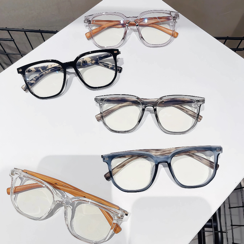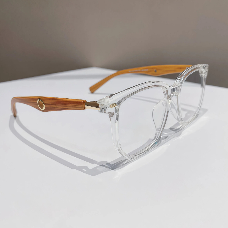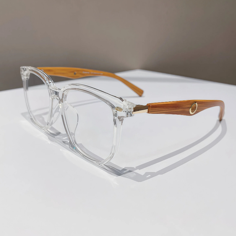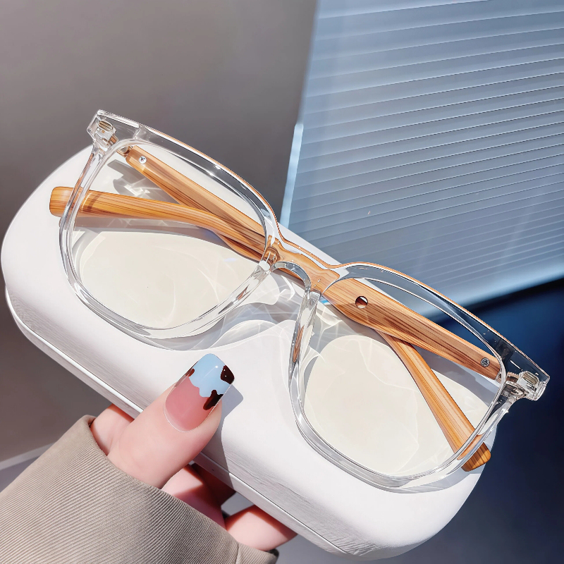 These trendy oversized square eyeglasses feature a clear TR90 frame and lightweight wood-pattern temple arms for a unique, natural vibe. Equipped with integrated nose pads for all-day comfort, this unisex design blends timeless style with practical functionality, perfect for any everyday look.