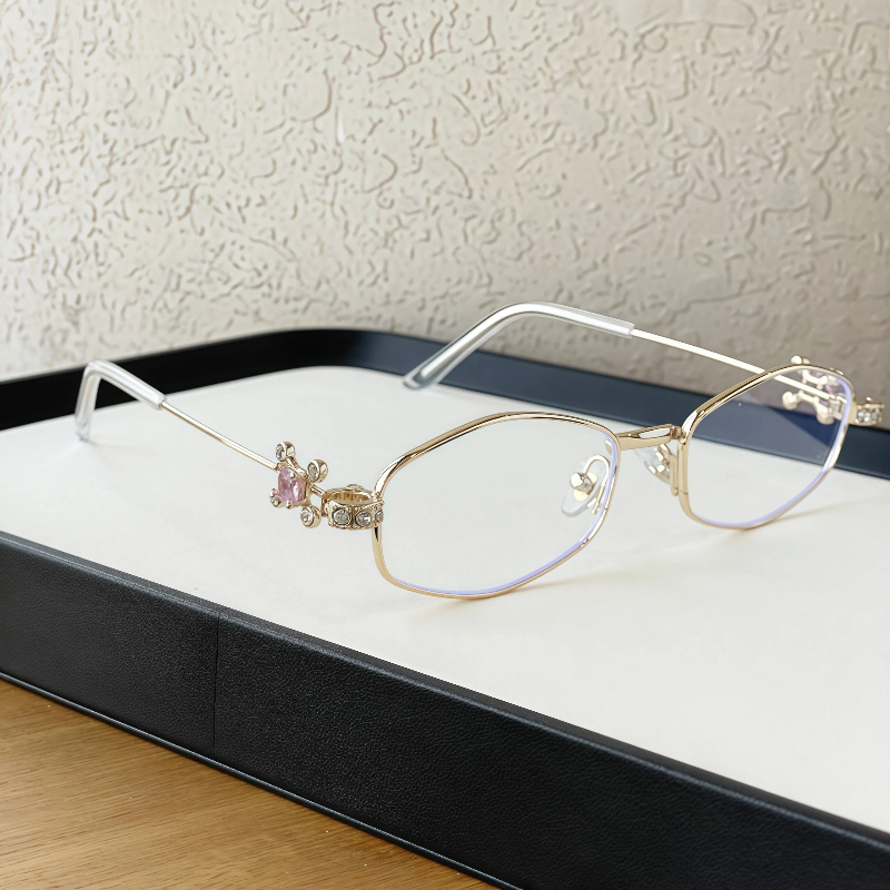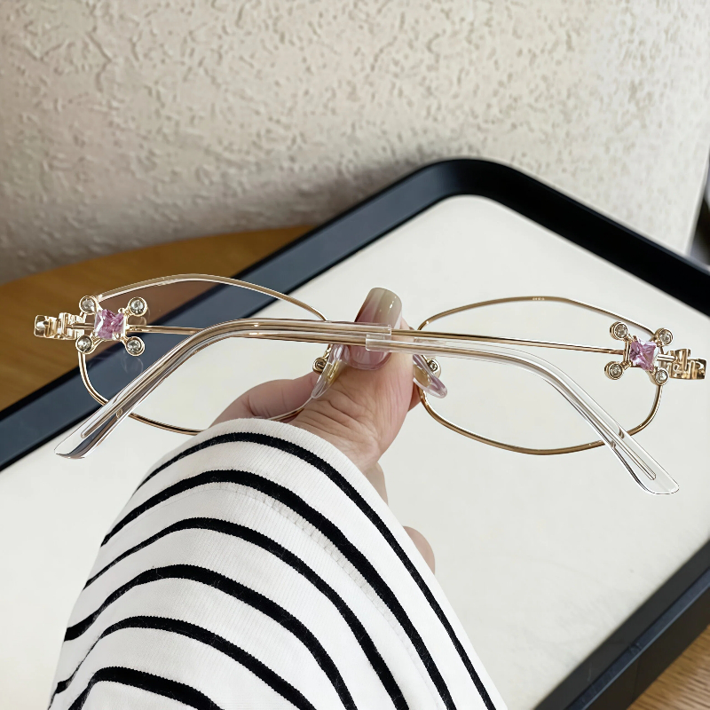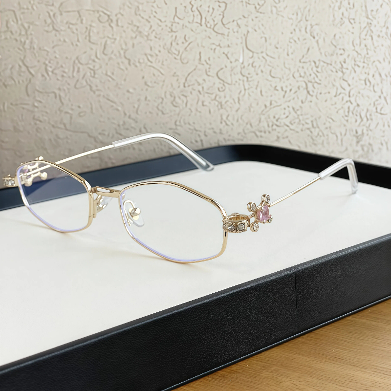 These sleek polygonal eyeglasses are crafted from lightweight metal, featuring sparkling rhinestone accents on the temple arms for a glamorous touch. The adjustable nose pads ensure a personalized, comfortable fit, making them perfect for elevating your everyday style or special occasions.