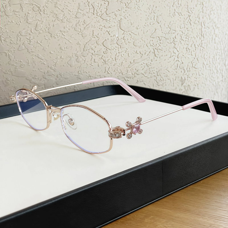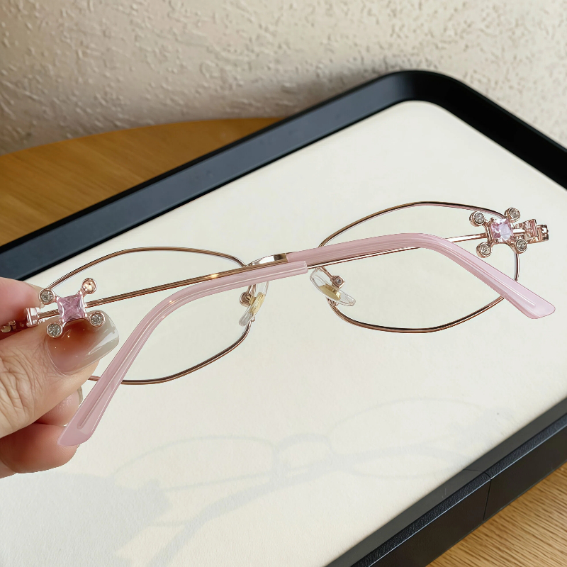 These sleek polygonal eyeglasses are crafted from lightweight metal, featuring sparkling rhinestone accents on the temple arms for a glamorous touch. The adjustable nose pads ensure a personalized, comfortable fit, making them perfect for elevating your everyday style or special occasions.