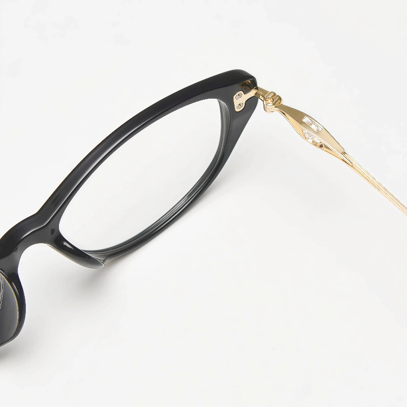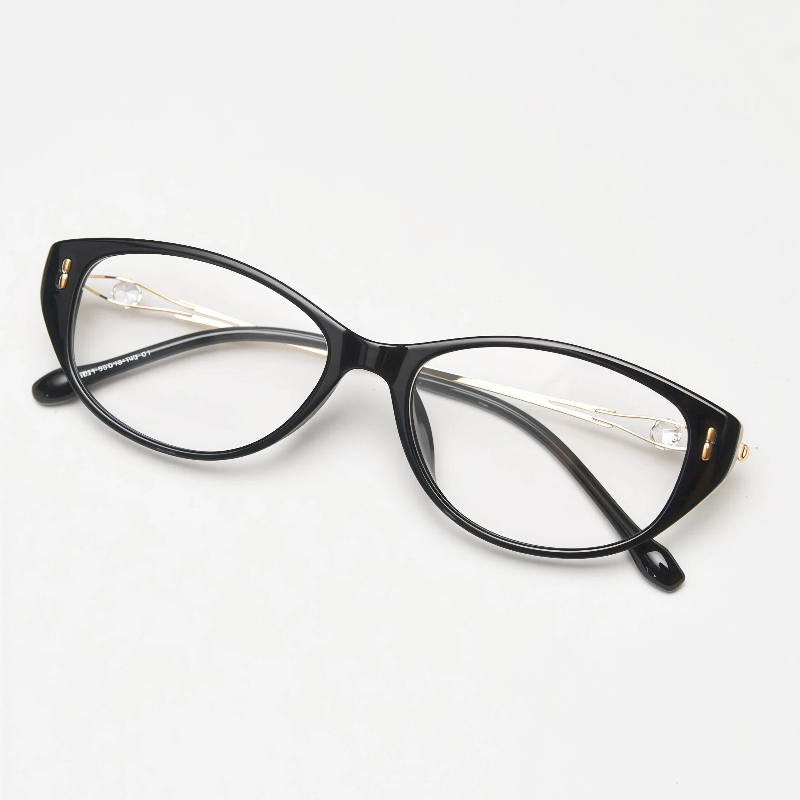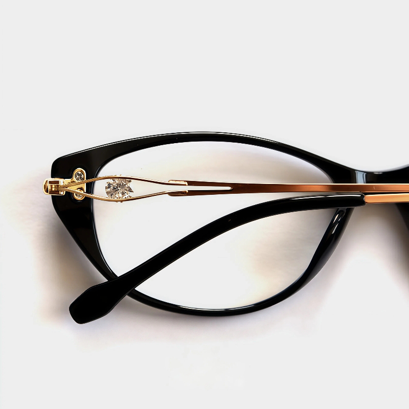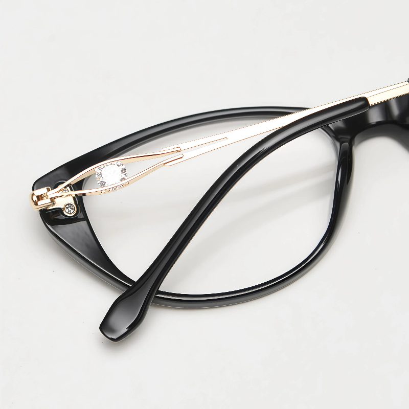 These iconic cat-eye frames are crafted from durable TR90 and sleek metal, featuring a one-piece nose rest for a stable fit. The slim metal temple arms are adorned with sparkling rhinestone accents, adding a touch of glamour to the classic design. Perfect for elevating both everyday looks and prescription wear.