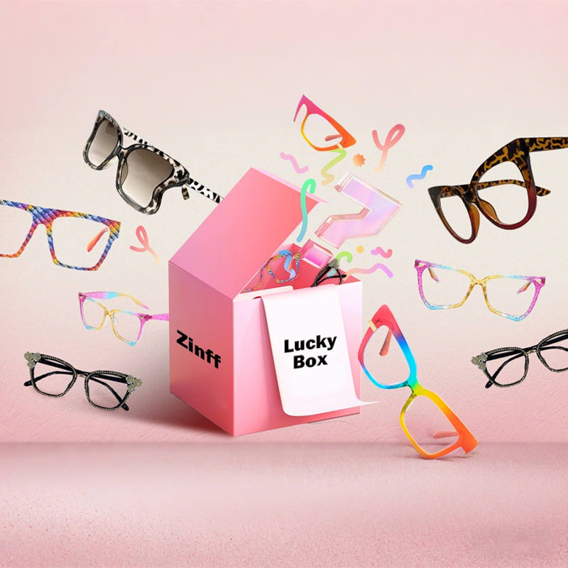 DESCRIPTIONBuy Zinff lucky box product for $4.99 and you will get 3 pairs of non-prescription glasses randomly from more than 30 pairs of glasses in the picture ( non-prescription optical Blue-Light Blocking eyeglasses or sunglasses ). High-quality fashion glasses are the best choice for your backup glasses.