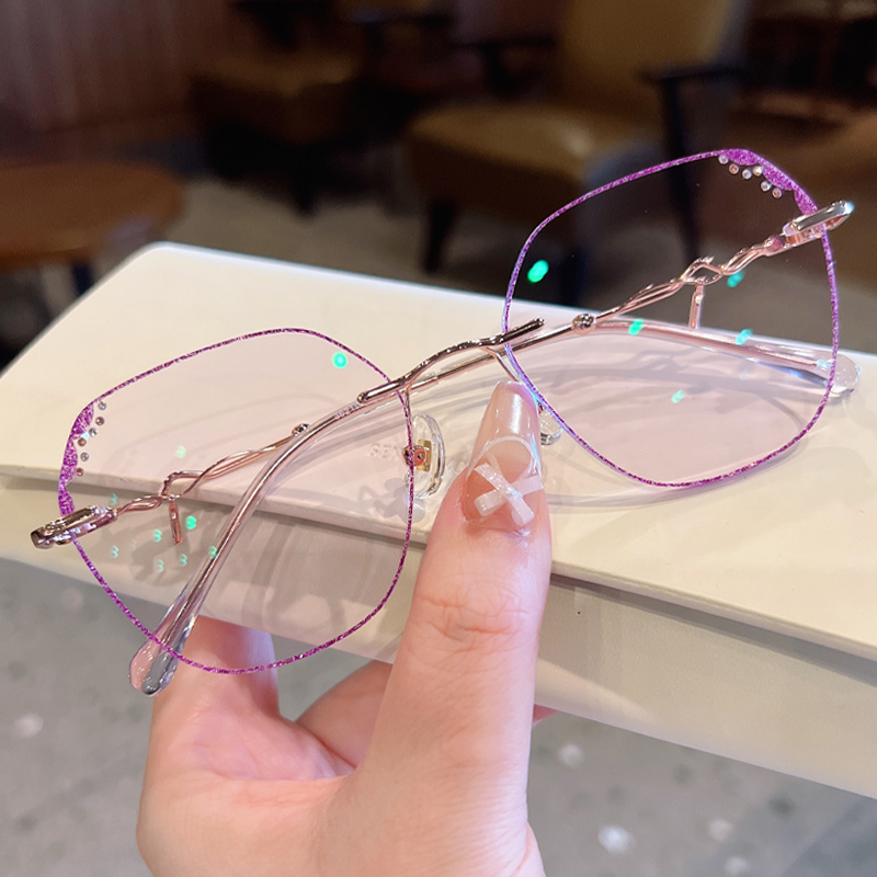 DESCRIPTIONCrafted from aluminum alloy, Frozen is shiny, lightweight, and corrosion-resistant, featuring subtle purple rhinestone details on the upper lens. Slim, wavy temples make this frame more stylish and sophisticated. Adjustable nose pads and transparent temple tips provide added comfort.
