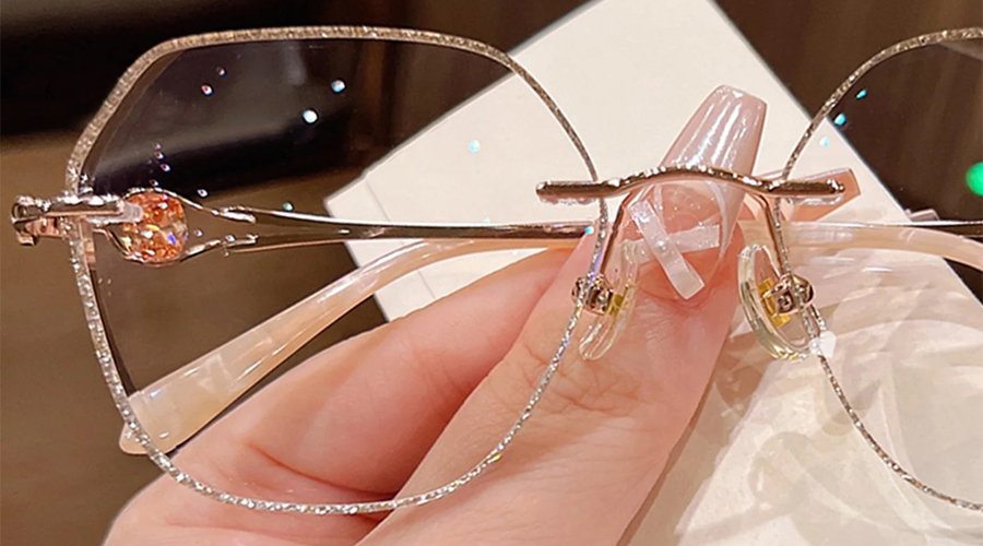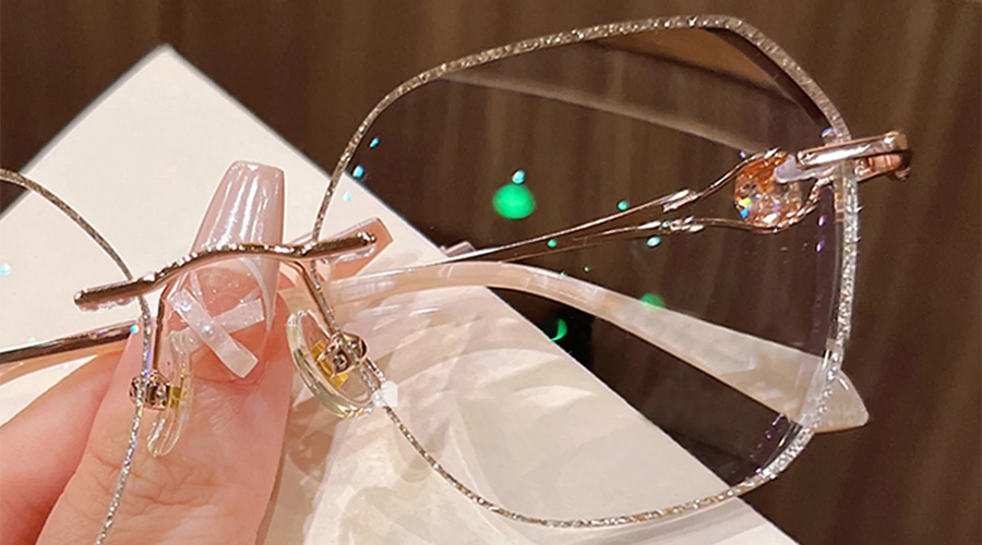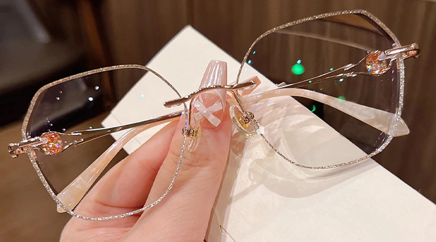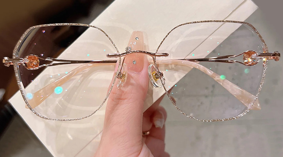 These "barely there" rimless glasses let your style shine with all-day comfort. Irregular lenses with gold powder adorning the edges add a touch of sophistication to this frame. Metal temples decorated with topaz and marbled temple tips enhance the elegant style.
