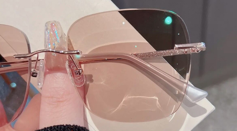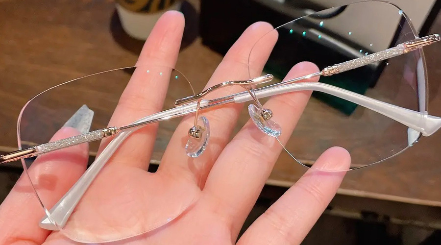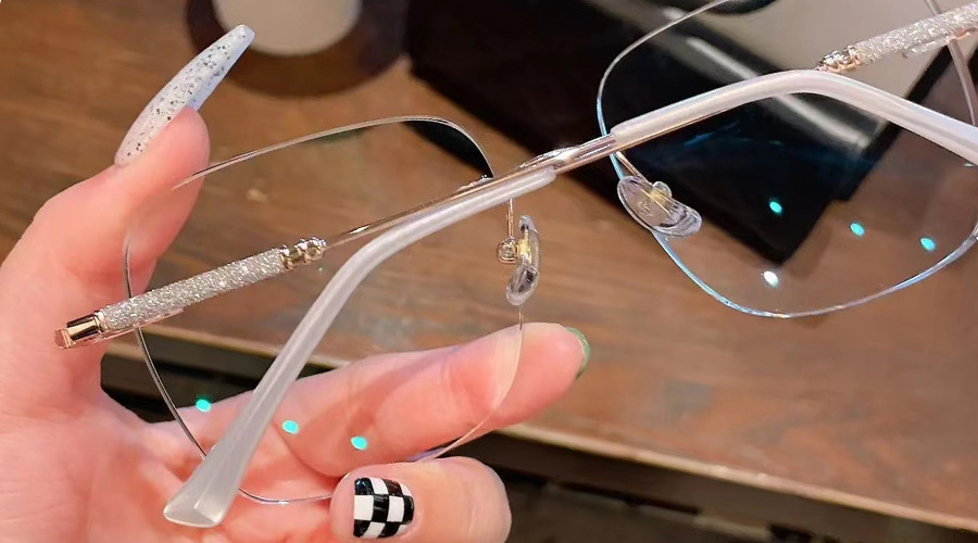 Pearl, a pair of stunning rimless eyeglasses, shows a feeling of nobility and elegance. Slim and delicate temples decorated with glitters add glamorous charm and modern touch to these glasses. Adjustable nose pads and square lenses increase wearing comfort.