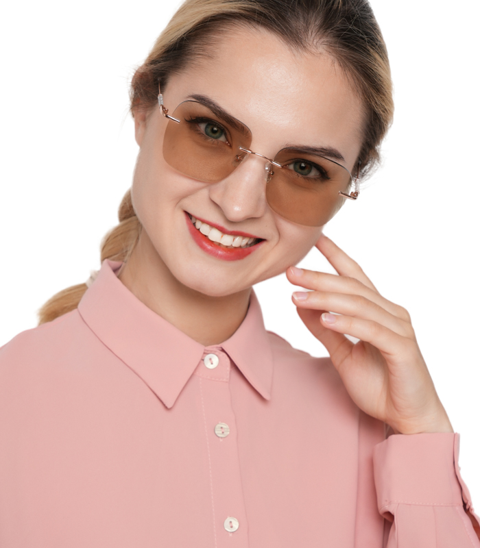 Photochromic Brown+Anti-Blue-Light Lenses: These rimless glasses feature Superflex lenses for impact resistance. Indoors, they are clear anti-blue-light glasses that block harmful blue light from digital screens. Outdoors, the lenses will change color from clear to brown and block UV rays.