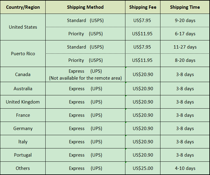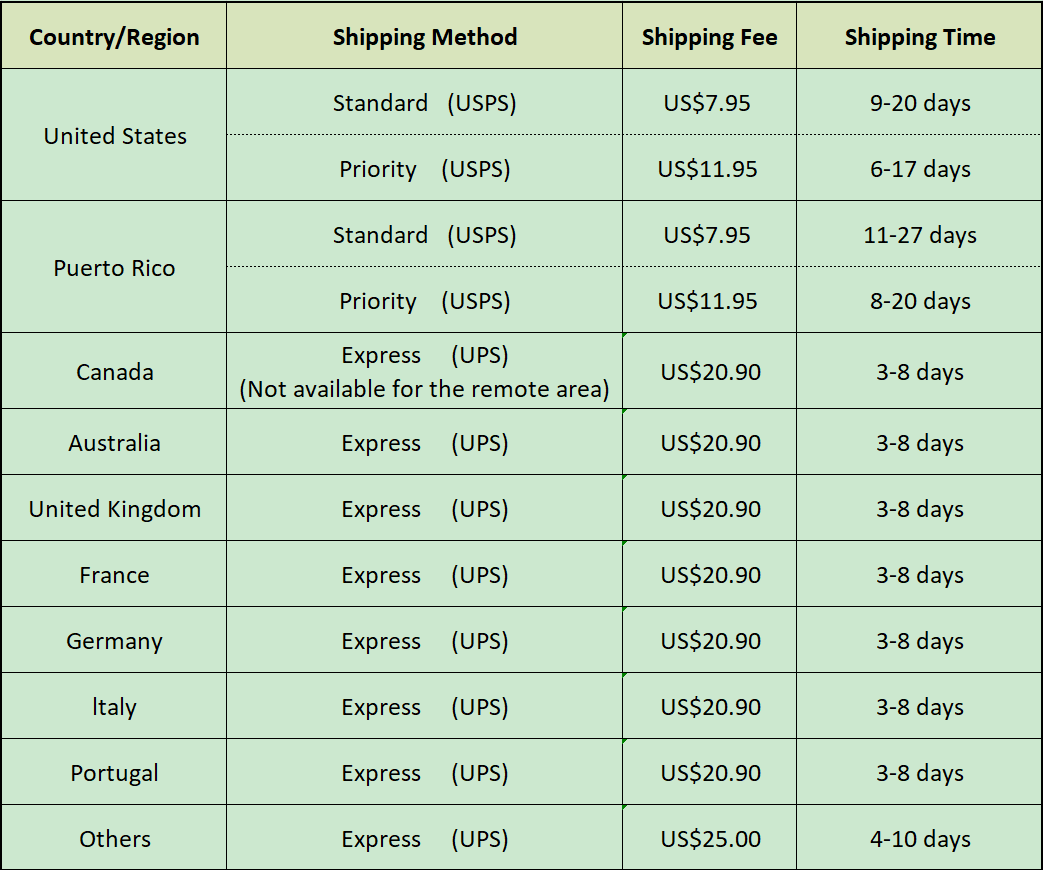 •To improve the customer shopping experience and address long delivery times, standard shipping has been discontinued in European countries. Now, only express delivery via UPS is available in European countries.