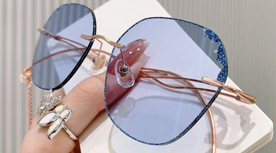 Photochromic Blue+Anti-Blue-Light Lenses: These rimless glasses feature Superflex lenses for impact resistance. Indoors, they are clear anti-blue-light glasses that block harmful blue light from digital screens. Outdoors, the lenses will change color from clear to blue and block UV rays.