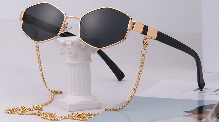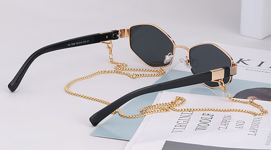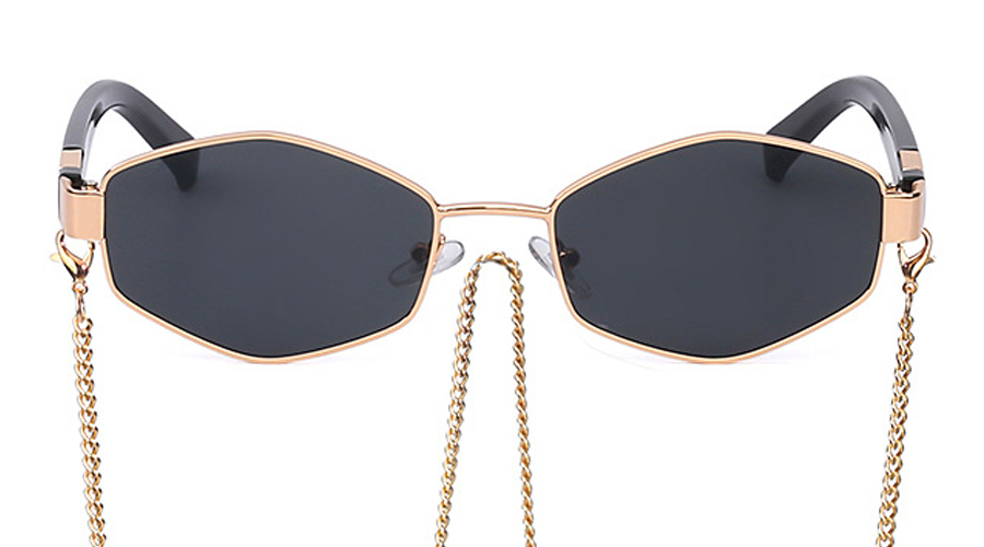 Channel vintage vibes with these chic geometric sunglasses. The trendy chain accessories on the temple add an heir of sophistication to these sunglasses. Adjustable nose pads provide added comfort. These sunglasses with tinted lenses offer 100% UV protection, anti-scratch, and impact resistance.
