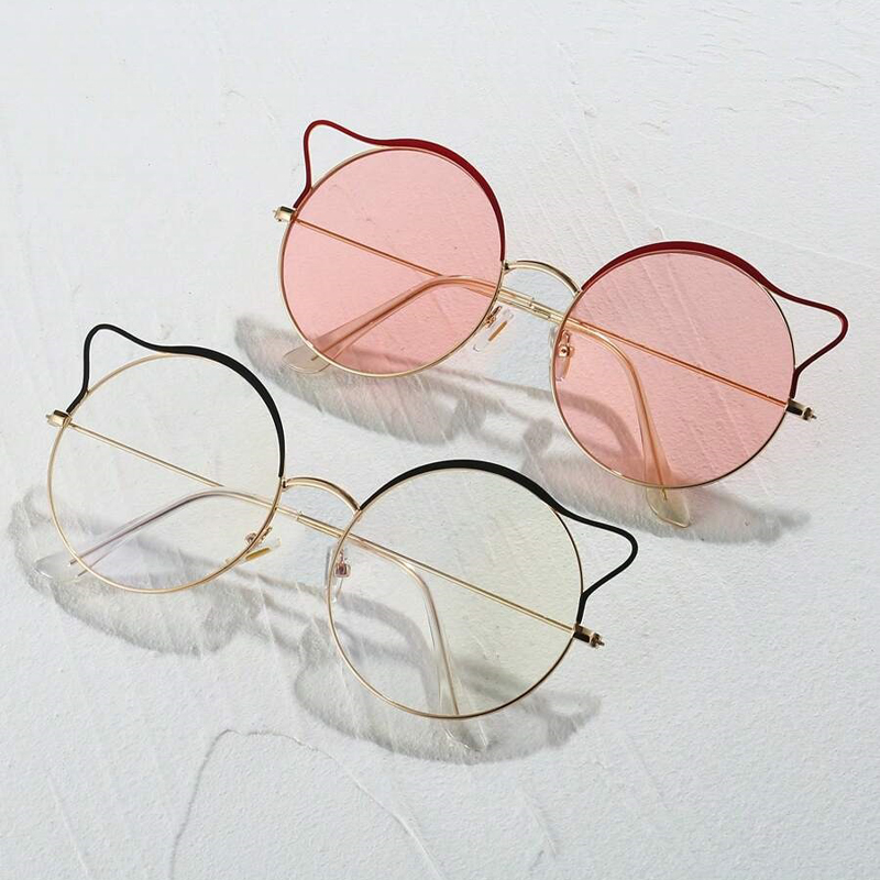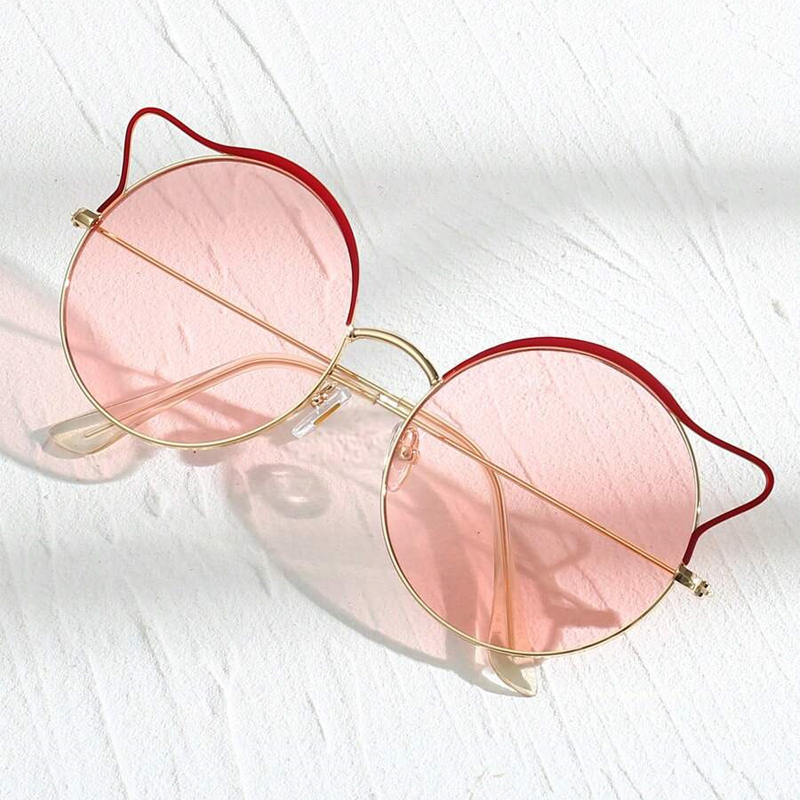 Add a bit of whimsy to your eyewear wardrobe with these metal cat-eye sunglasses. They feature round lenses with kitty ear accents on the outer corners. Adjustable nose pads provide a comfortable fit. These sunglasses with tinted lenses offer 100% UV protection, anti-scratch, and impact resistance.