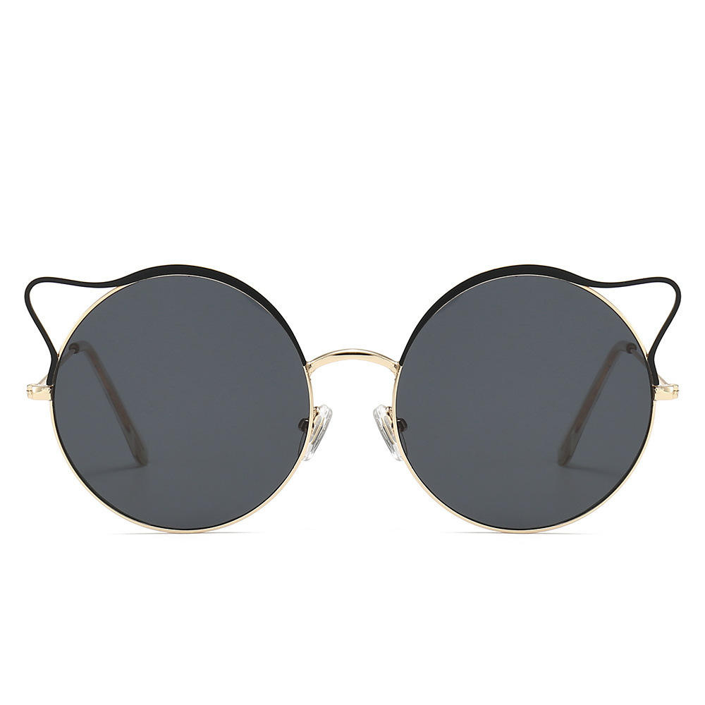 Add a bit of whimsy to your eyewear wardrobe with these metal cat-eye sunglasses. They feature round lenses with kitty ear accents on the outer corners. Adjustable nose pads provide a comfortable fit. These sunglasses with tinted lenses offer 100% UV protection, anti-scratch, and impact resistance.